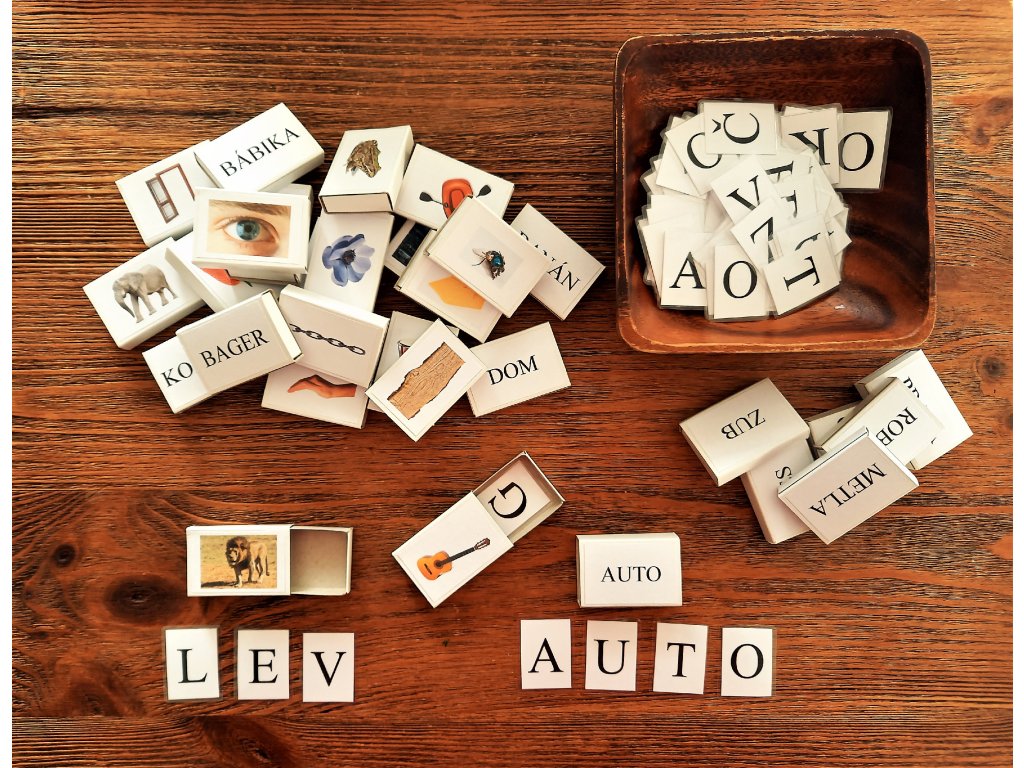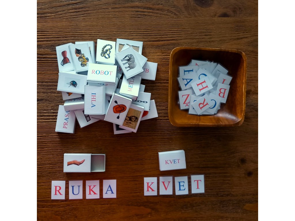 Aktivita obsahuje 30 krabičiek veľkosti zápalkových, ktoré majú z jednej strany obrázok a z druhej strany slovo (je to kontrola pre väčších alebo pomôcka pre menších). V krabičkách sú vložené zalaminované písmená s veľkosťou 3x4 cm, spolu ich je 130 ks. Aktivita môže byť buď v ružovo-modrej montessori verzii, alebo môžu byť všetky písmená čierne.