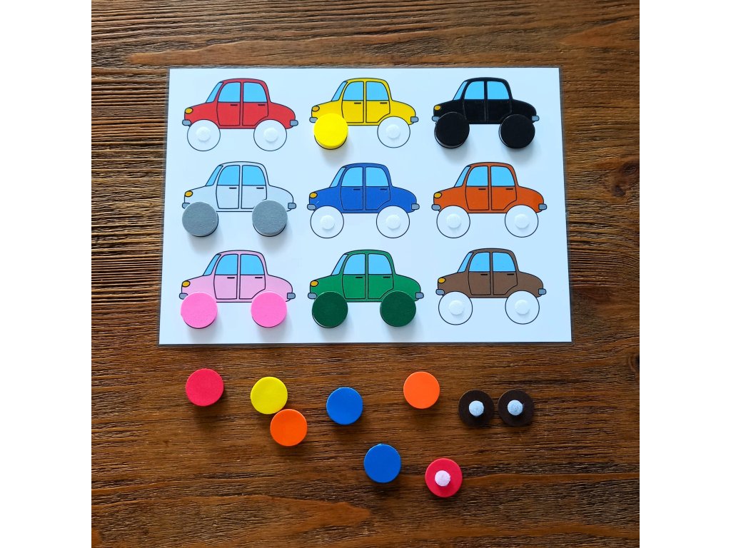 Aktivita na ukladanie podľa farby. Podklad má rozmer A4 a je zalaminovaný, kolieska sú vyrobené z machovej gumy.