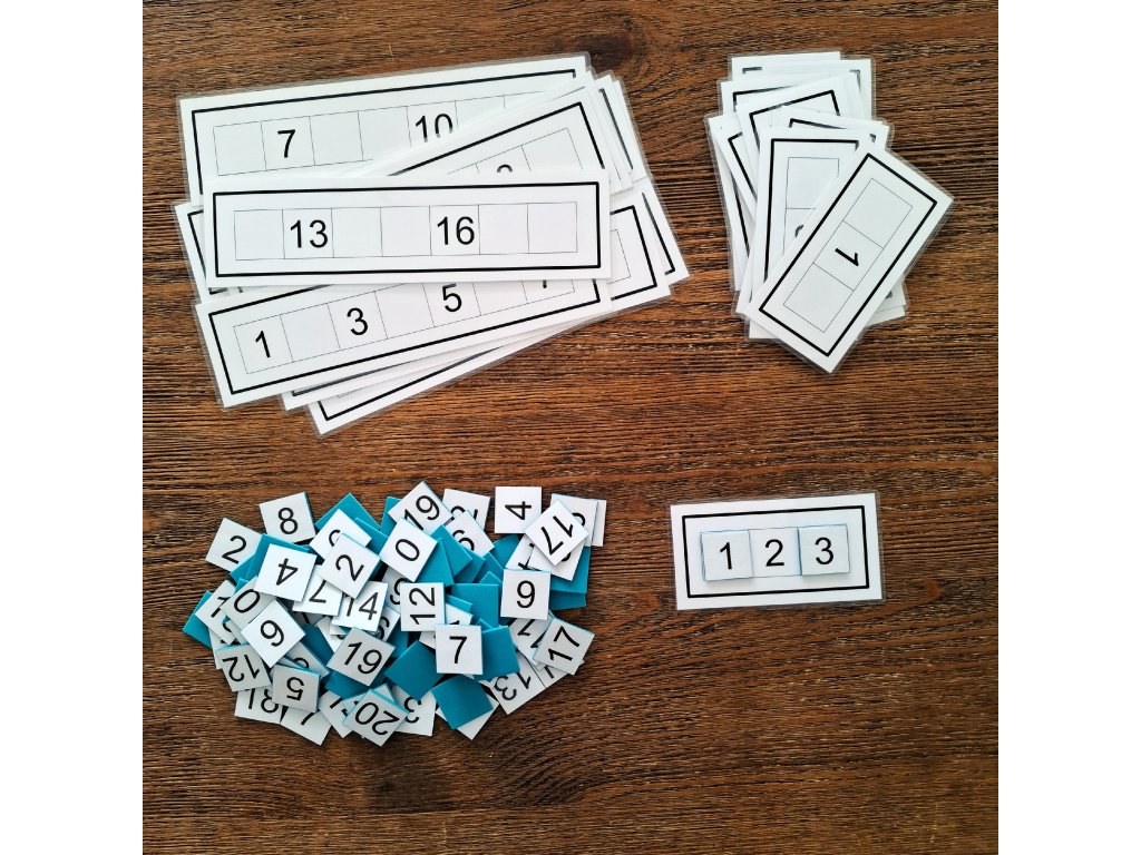 Aktivita obsahuje zalaminované podklady rôznej obtiažnosti a zalaminované čísla podlepené machovou gumou na prikladanie. (Farba machovej gumy sa môže líšiť. Ak by ste si priali nejakú konkrétnu, môžete mi to napísať.)