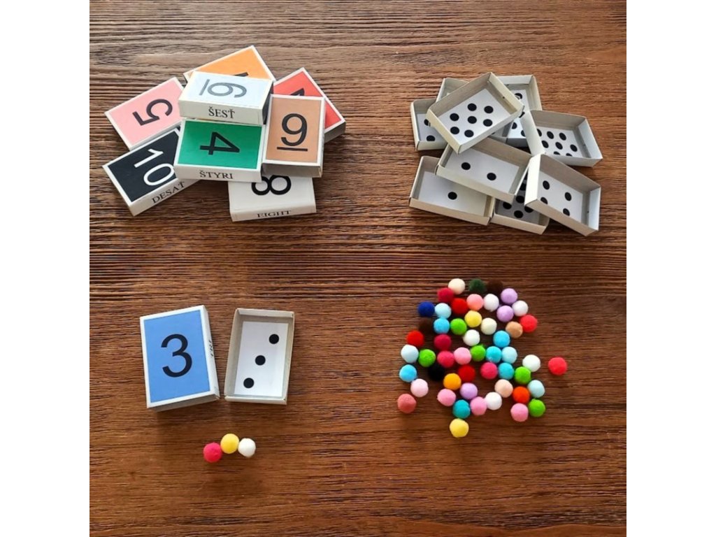 Aktivita obsahuje 10 krabičiek veľkosti zápalkových a 55 pompom guličiek s priemerom 1 cm.