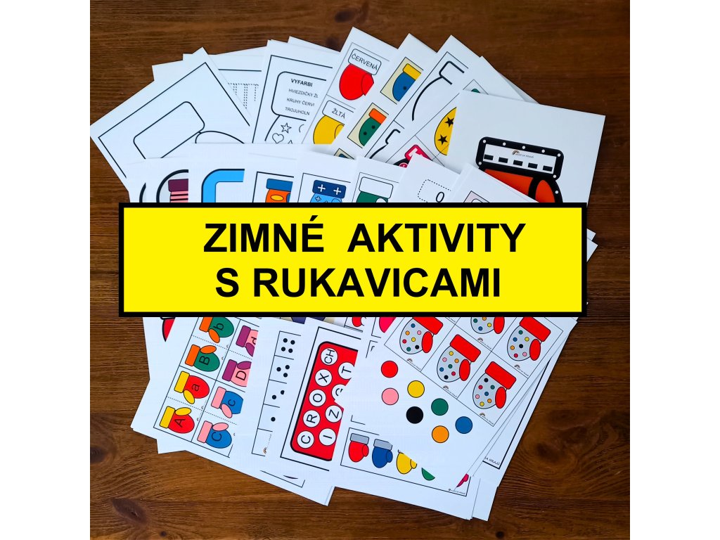 PDF súbor AKTIVITY S RUKAVICAMI obsahuje 25 aktivít na 60 stranách formátu A4. Nájdete tu aktivity zamerané na farby, tvary, určovanie množstva, logiku, prikladanie podľa predlohy, navliekanie, prevliekanie, puzzle, grafomotorické cvičenia, pracovné listy, vyfarbovanie, štipcovanie, veľkosti.