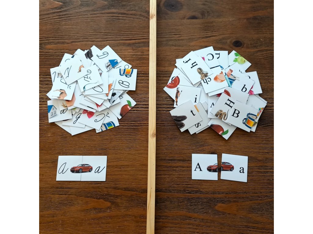 Priraďovačka na precvičovanie abecedy. Spolu 60 zalaminovaných kartičiek s rozmerom 5x5 cm, 30 písmen. Môžete si vybrať tlačenú alebo písanú abecedu.