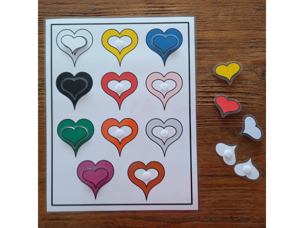 Aktivita obsahuje podklad formátu A4 a srdiečka, ktoré sa priliepajú pomocou suchých zipsov. Zalaminované.