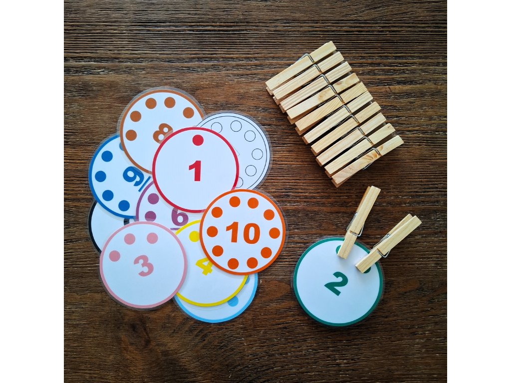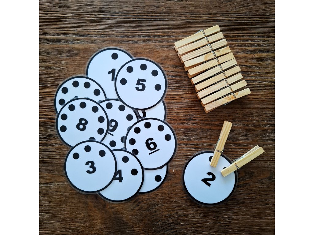 Aktivita na uvedomenie si množstva v čiernobielej alebo farebnej verzii (montessori farebnosť perlového materiálu) obsahuje 11 zalaminovaných kruhov s priemerom 8,5 cm. Štipce nie sú súčasťou aktivity.