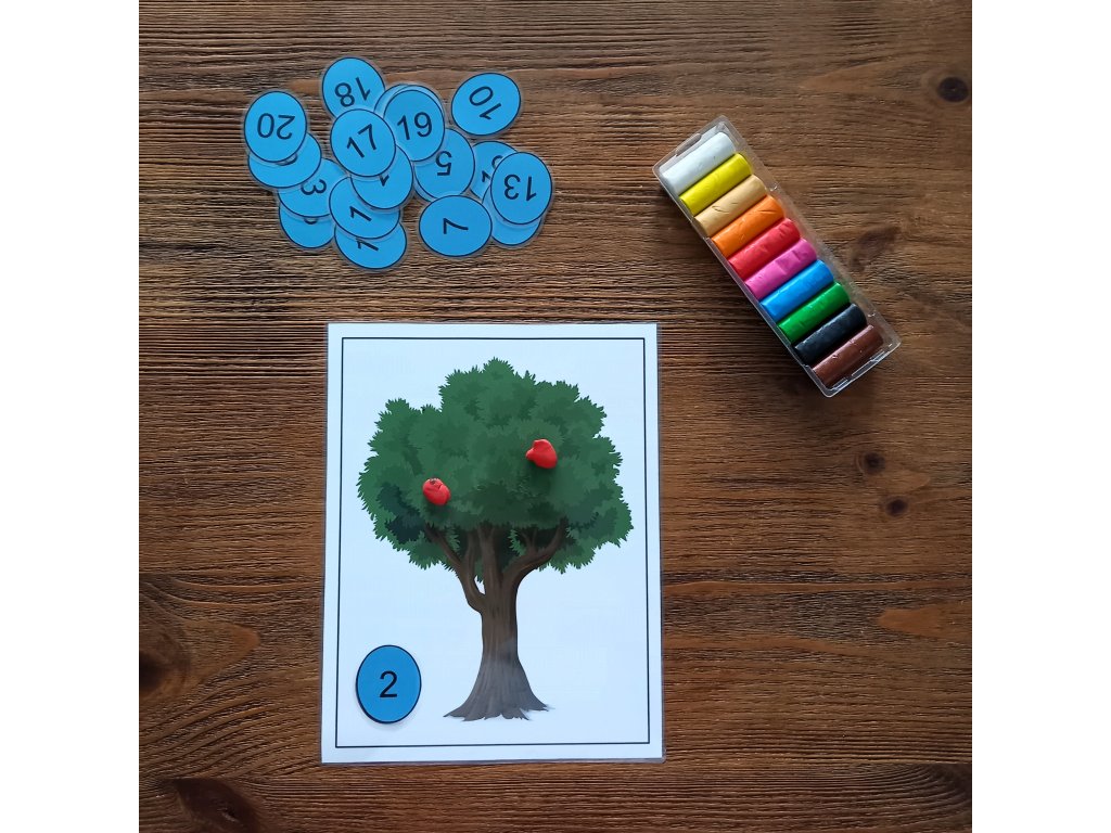 Aktivita obsahuje podklad s formátom A4 a 20 kartičiek s číslami, zalaminované. Plastelína nie je súčasťou aktivity.