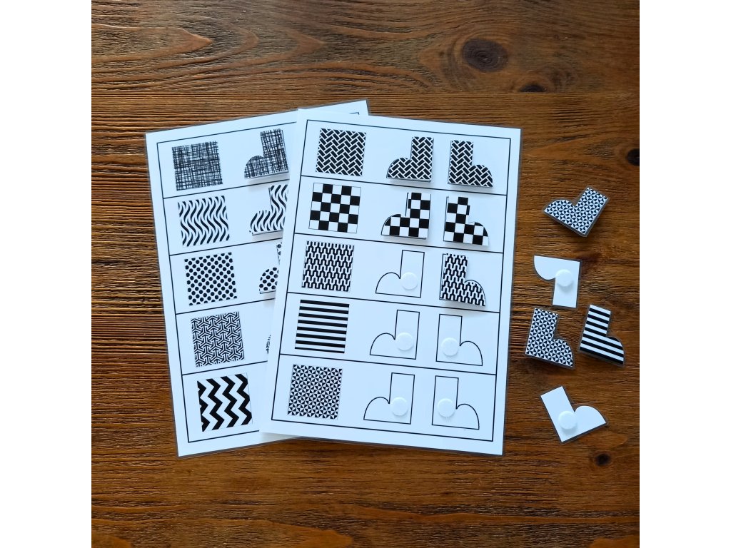 Aktivita na priraďovanie vzorov a trénovanie ľavo-pravej orientácie obsahuj 2 podklady formátu A4 a topánky na priliepanie pomocou suchých zipsov